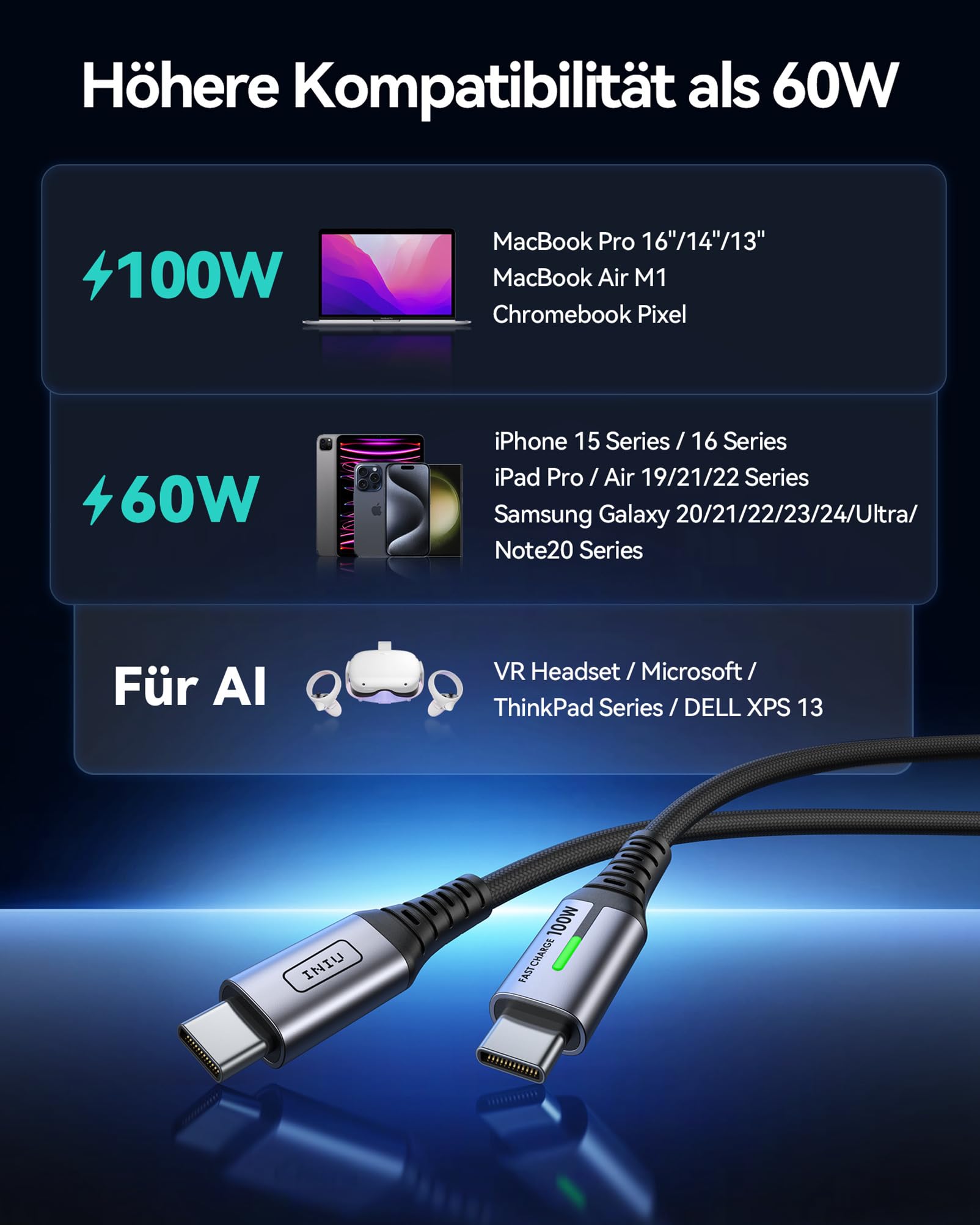 - Unübertroffene Kompatibilität: Mit seinem leistungsstarken 100W-Ausgang kann es eine größere Anzahl von Geräten aufladen als Geräte mit 60W-Kabeln, darunter aller USB-C-Handys, Tablets, fast alle Flaggschiff-Laptops, Switch usw.