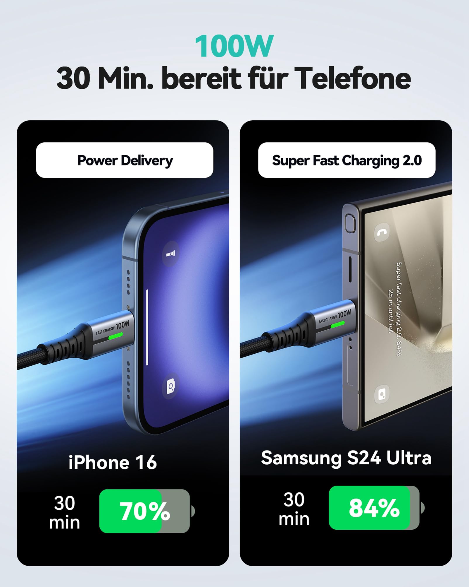 - Holen Sie sich die schnellste Ladeleistung für Ihr iPhone 15: Erleben Sie die nächste Stufe des Ladens! Mit unserem blitzschnellen 100W USB-C auf USB-C Kabel erreicht Ihre iPhone 15 Serie in nur 30 Minuten erstaunliche 71% Akkuleistung. Verpassen Sie nicht diese Laderevolution!